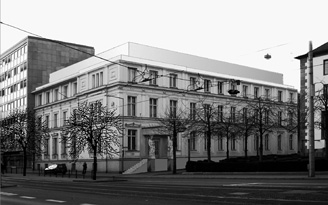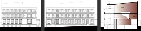 Die Aufstockung in leichter Stahlbauweise ist zurückgesetzt und vollflächig transluzent verglast. Die entstehenden Flachdachflächen sind begehbar und zum Aufenthalt geeignet. Der Besucherempfang ist zentral im Erdgeschossbereich des Hauptrisalits angeordnet. Das offene Treppenhaus wurde entfernt. Die Sondernutzungen sind um den Hauptrisalit gruppiert. Die Garderobe sowie WC- Anlagen befinden sich im Untergeschoss und sind über die einläufige Treppe erschlossen. Hauptausstellungsflächen Die Hauptausstellungsflächen sind in den Obergeschossen als Rundgang angeordnet. Über einläufige Treppen im dreieckigen Anbau wird ein Raumkontinuum erzeugt. Jede dieser Flächen erhält einen eigenen Charakter, die zu verschiedenen Zeiten vorgenommenen baulichen Überformungen des Bestandes werden herausgearbeitet und materialgerecht ergänzt. Die dreiecksförmige Ergänzung bietet mit den eingestellten Treppenanlagen und den Verknüpfungen zum Altbau eigenständige neue Ergänzungsflächen, die museumsgerecht eingerichtet werden können. |