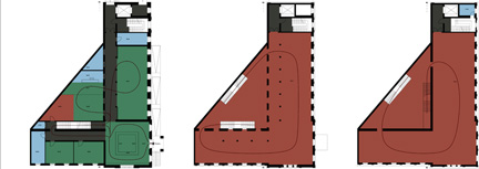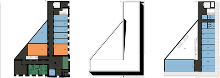 Die Bibliothek und Verwaltung sind in der Aufstockung temporär angeordnet. Beide können über eine spätere Erweiterung nach Norden ausgelagert werden. Nebennutzungen befinden sich im Untergeschoss. Die nordseitige Stirnwand wird um eine Achse mit einem Fluchttreppenhaus und behinderten gerechten Lastenaufzug erweitert. |